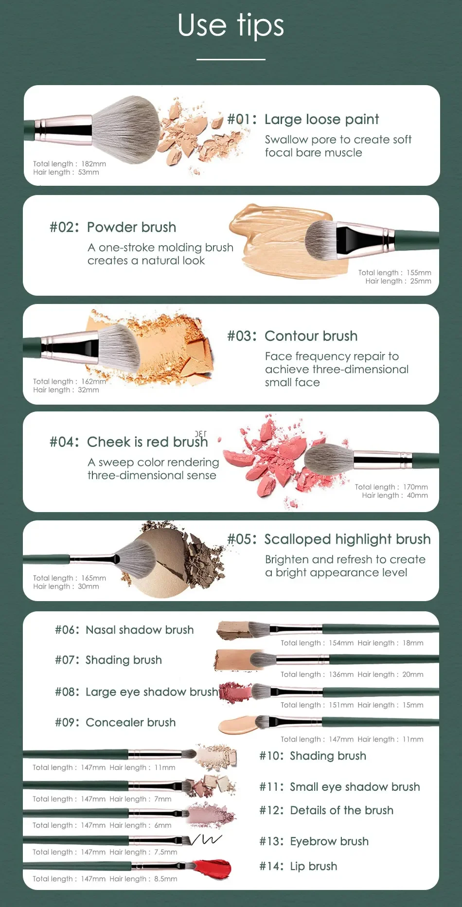 Elevate your makeup routine with this 14-piece makeup brush set, designed for flawless application and professional results. Each brush features soft, high-quality wool fiber bristles that glide smoothly on the skin, ensuring even coverage and seamless blending for powder, foundation, blush, and eyeshadow.